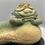 Die Figur auf dieser schwarz-matt lackierten Basis ist wirklich gut gelungen. Mag man doch denken, der Wurm ist recht simpel abzubilden. Doch insbesondere bei einer einfachen Kontur des Umrisses kommt es vor allem auch auf die Details an, die hier geboten werden. Und da ist Jabba meines Erachtens eben ganz Jabba. Von der passenden Farbgebung sowie den gebotenen Details bei der Handbemalung – gut gelungen. Dazu gehören Dinge wie eine Wunde auf dem Schwanz sowie ein Tattoo auf seinem rechten ‚Ärmchen‘, bis hin zu den fantastischen Augen und dem etwas selbstgefälligen Stil, wie Jabba hier eben… sitzt.